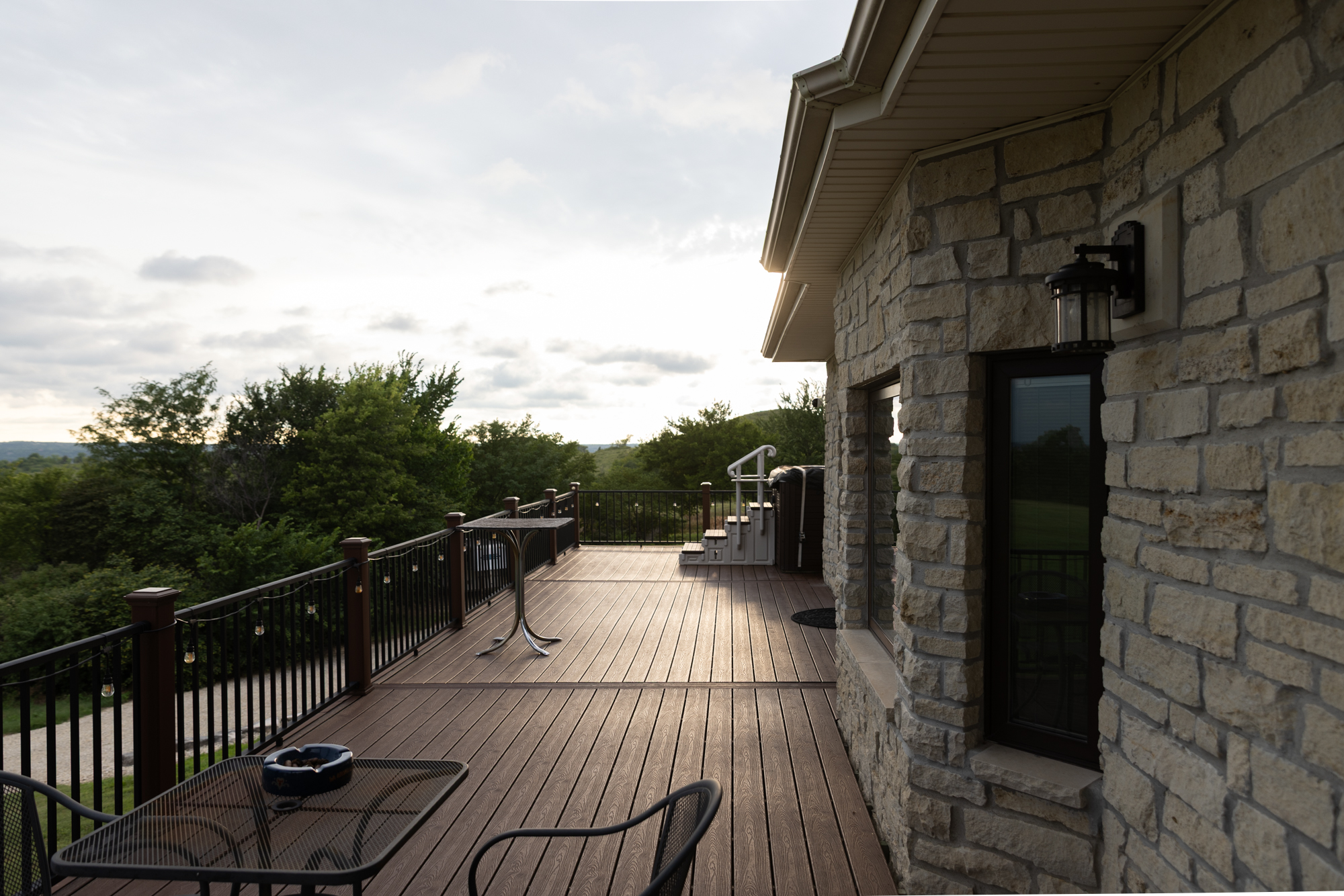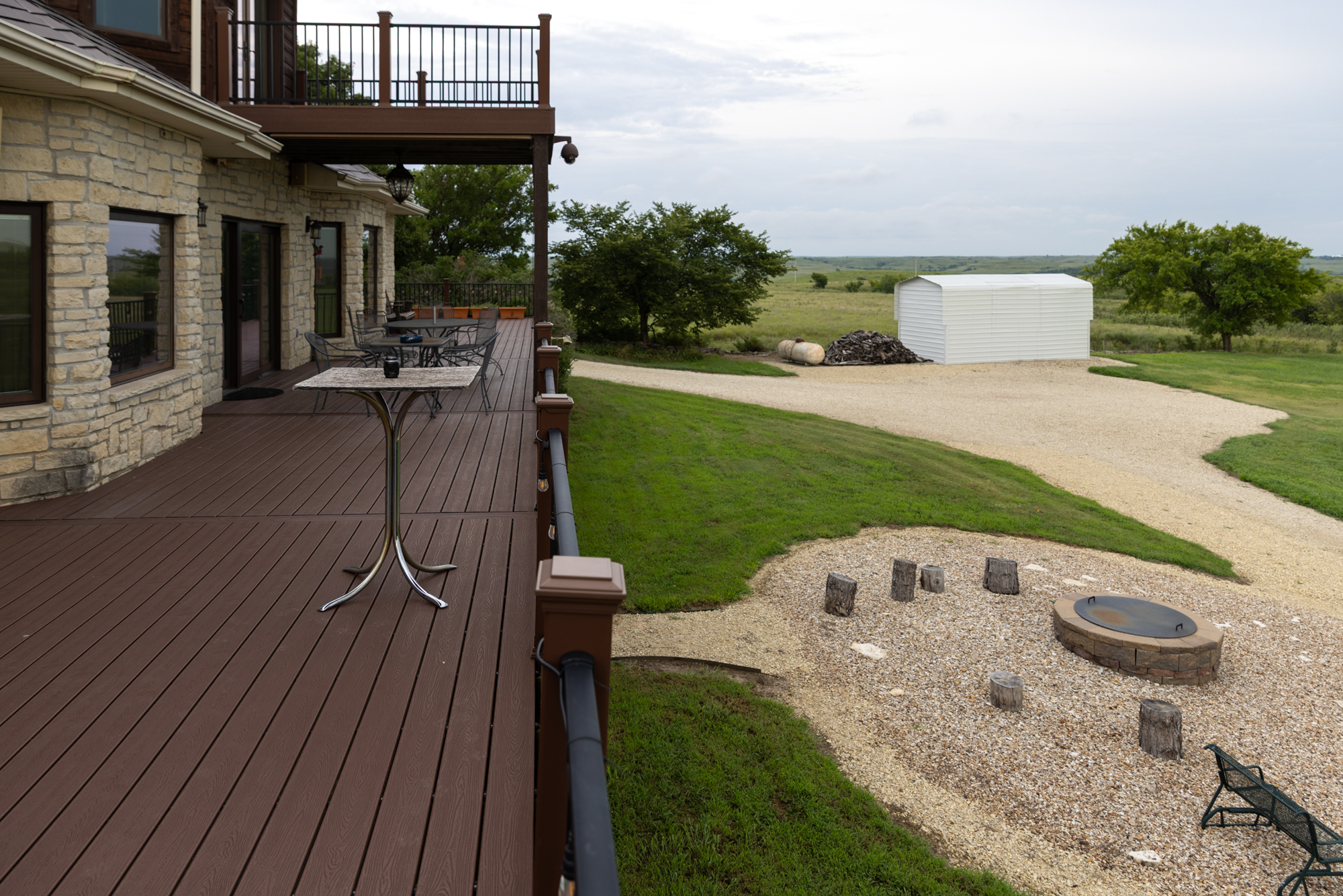 - Top level features french doors opening to an elevated private balcony that showcases views of the surrounding landscape and Tuttle Creek Reservoir.